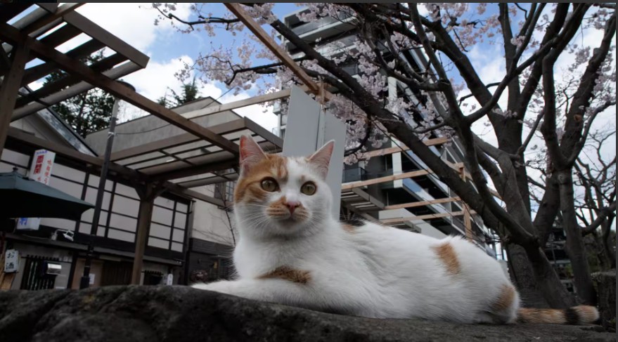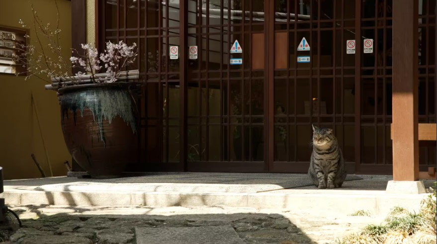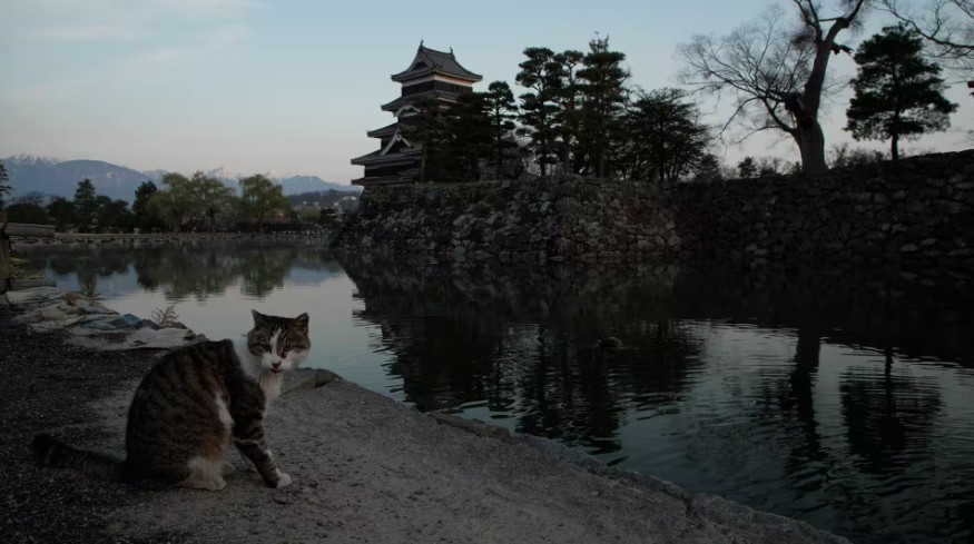 今回は松本。松本城でネコは見返りのポーズ。なわて通りでは三毛ネコの案内で桜の木の下に。信州の春とネコ。郊外では、庭にあんずの花、ここにも春の香りが。山あいのそば屋には微妙な関係のオス2匹、互いに意識する様子が面白い。北アルプスを見ながらネコと91歳、ネコをかわいがる姿にほっこり。