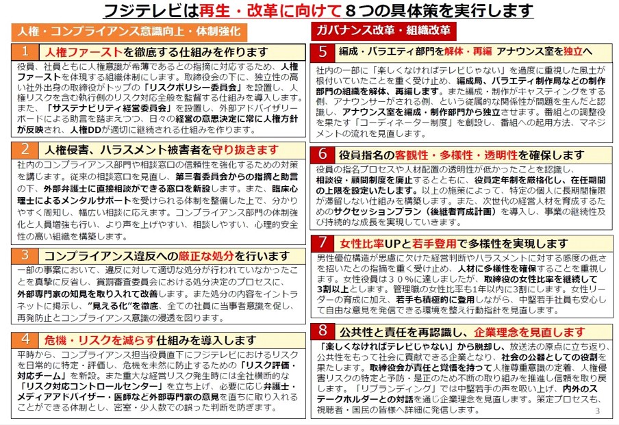 4月30日、フジテレビは、再生・改革に向けた取り組み状況を明らかにした。これまでDNAとして刻まれていると説明してきた「楽しくなければテレビじゃない」から脱却し、公共性と責任を再認識する。編成局、バラエティ制作局の組織を解体・再編するほか、アナウンス室を編成局から独立させ、権限を強化する。処分の厳正化などコンプライアンス体制を強化し、女性の比率アップに向け取締役に加えて管理職でも3割以上を実現としている。