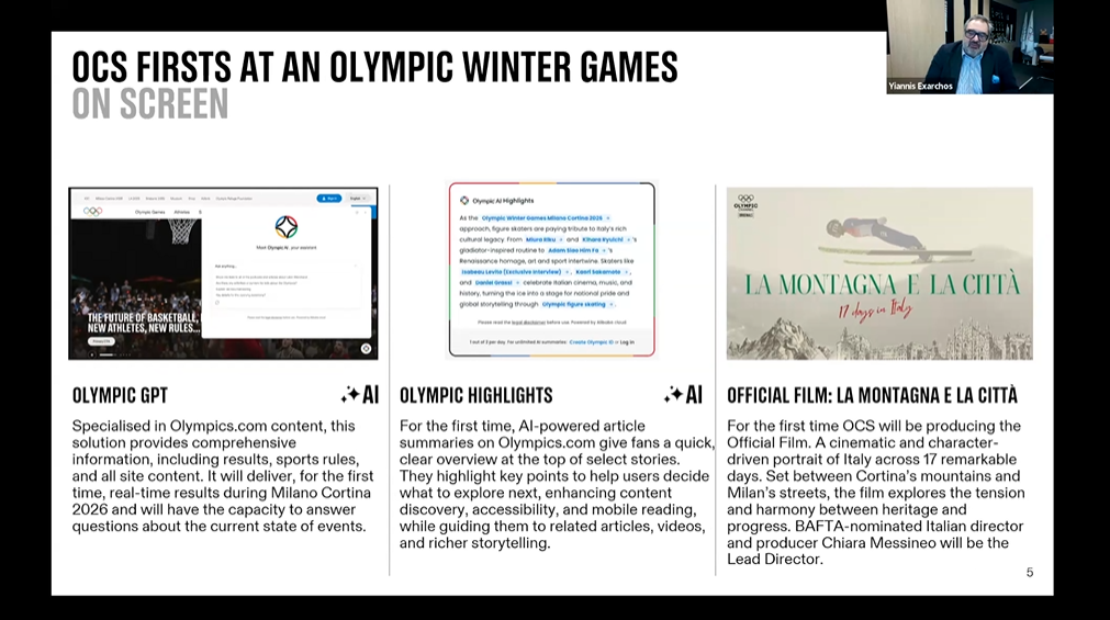 冬季五輪大会としては、初めて、AI自動ハイライト編集システムを導入する。競技終了後数分間で、高品質のハイライト映像クリップ(Ready-to-Publish Clips)が生成され、すべての放送機関等(MRHs)のサービスされる。パリ五輪2024では、約10万以上のハイライト・クリップが提供された。