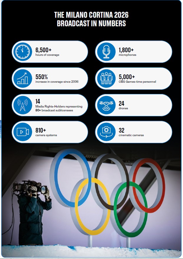 Milano Cortina2026では、コンテンツの配信時間が北京冬季五輪2022より8.3%以上増加する一方で、Milano Cortina2026の国際放送センター(IBC)はIBCは北京冬季五輪2022より25%縮小され、競技会場(Venue)の放送コンパウンドスペースは16%縮小される。消費電力も大幅に削減される点が注目される。放送システムのIP化、クラウドの導入、放送機関のリモート・オペレーションの普及などが大きく寄与していると思われる。- 各国メディアのMilano Cortina2026サービス