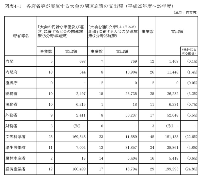 - 2018年10月4日、会計検査院は2020東京オリンピック・パラリンピックの開催経費ついて、平成25年度から29年度までの5年間に国が支出した開催経費が約8011億円に上ったと指摘した。