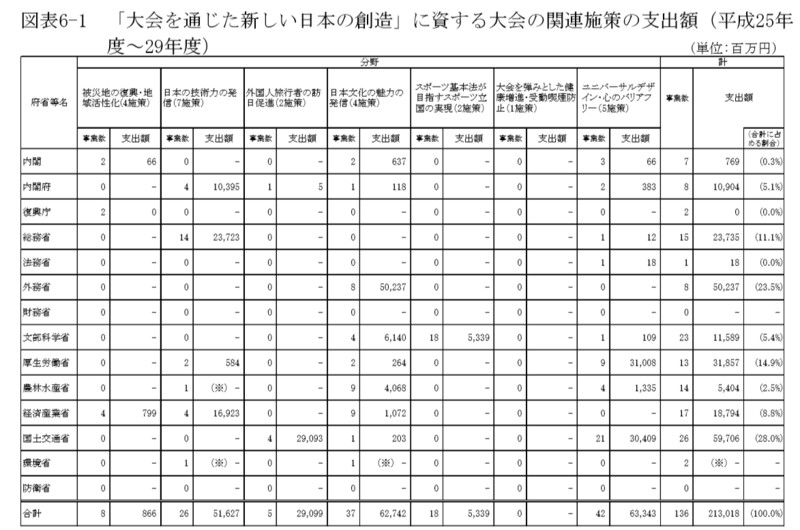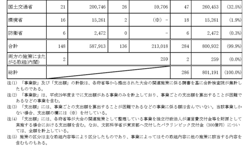 さらに会計検査院は大会後のレガシー(遺産)を見据えた「大会を通じた新しい日本の創造」の支出、159事業、約2695億円を「五輪関連経費」とした。