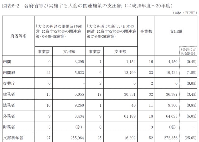 今回の指摘で、組織委が公表した国の負担分1500億円から除外した競技場周辺の道路輸送インフラの整備(国土交通省)やセキュリティー対策(警察庁)、熱中症に関する普及啓発(環境省)などの約280事業に対し、約6500億円が使われていたことが明らかにした。