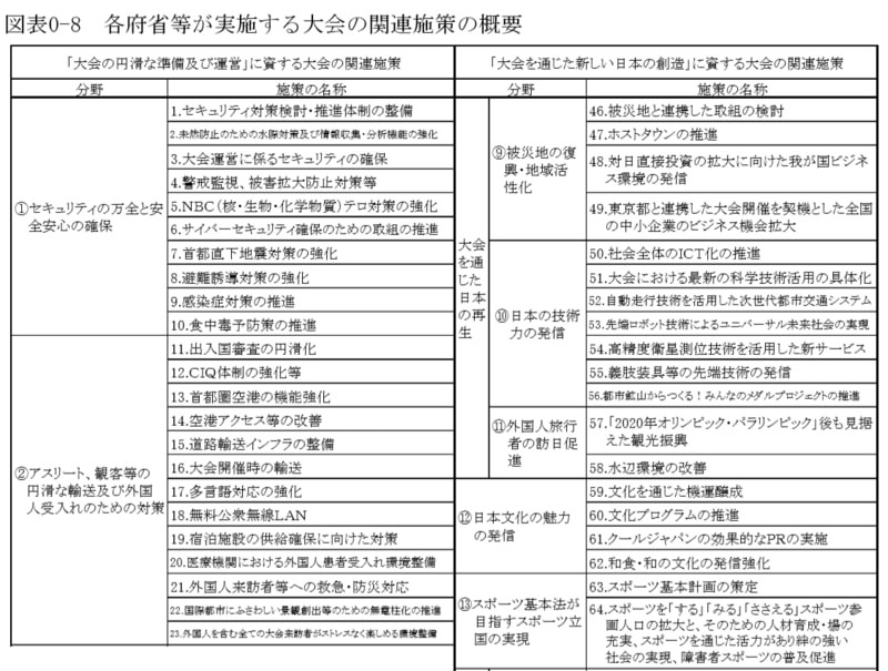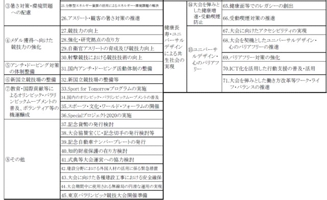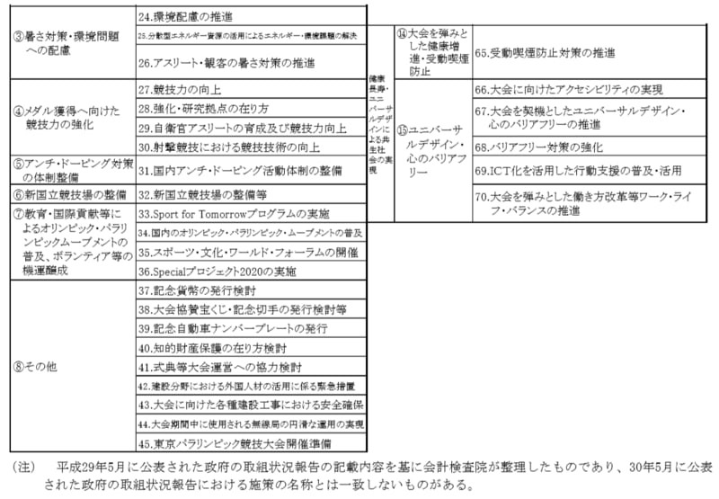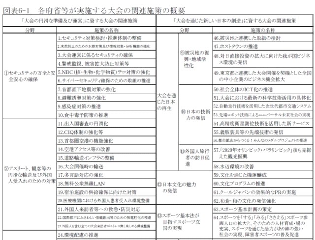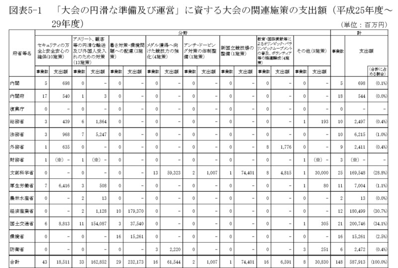 「大会の円滑な準備・運営」に資する関連施策では、セキュリティーの万全と安全・安心の確保(10施策)、アスリート、顧客等の円滑な輸送及び外国人受け入れ対策(13)、暑さ対策、環境問題への配慮(3)、メダル獲得に向けた競技力の強化(4)、アンチ・ドーピング対策の体制整備(4)、新国立競技場の整備(1)、教育・国際貢献等によるオリンピックムーブメントの普及、ボランティア等の機運醸成(4)、その他(9)の合計148事業、5879億1300万円(平成25年~29年)とした。