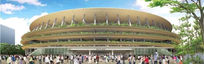 新国立競技場の完成予想図。環境に配慮して高さが当初案より5メートル低い70メートルになった 出典 日本スポーツ振興センター