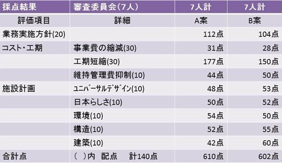 日本スポーツ振興センター(JSC)が関係閣僚会議に報告した審査委員会(委員長=村上周三東京大名誉教授)の審査結果は、A案が610点、B案が602点だった。A案は工期短縮の項目で177点(B案は150点)と高い評価を得たのが決め手となった。注目されるのは、デザインや日本らしさ、構造、建築の項目ではB案が上回っていることである。B案に参加した建築家の伊東豊雄氏は採点結果の妥当性について疑問を投げかけている。
