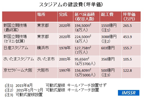 現在では国内最大規模の日産スタジアムの「坪単価」は155.7万円、サッカー専用スタジアムとては東アジアで最大規模のさんたまスタジアムは105.5万円、屋根を備えている京セラドーム大阪は122・8万円である。