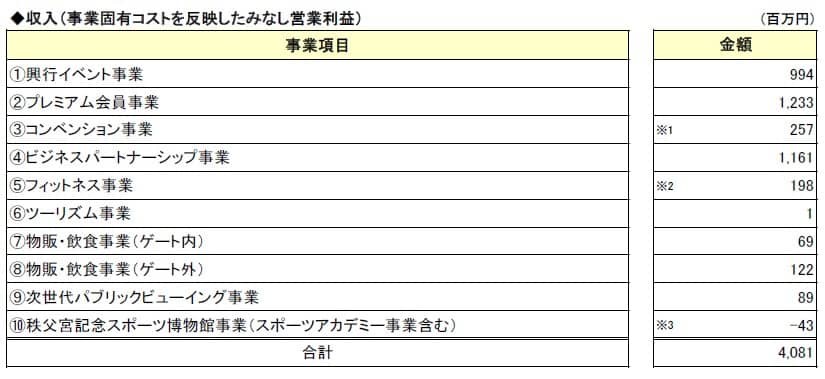 そのほか、年間最高700万円のVIP室や会員専用シートの契約料で12億5千万円(プレミアム会員事業)、競技場を企業の広告に利用できる権利の使用料などで10億9000万円(ビジネスパートナーシップ事業)、コンベンションの開催で1億8000万円(コンベンション事業)を見込んだ。
