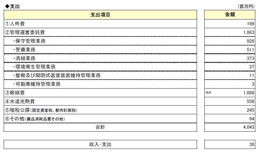 一方、支出では人件費が1億9900万円、管理運営委託費が18億6300万円、その内保守管理業務は9億2800万円、警備業務は5億1100万円、清掃業務は3億7300万円、屋根及び開閉式遮音装置維持管理業務は1100万円、可動席維持管理業務は300万円である。