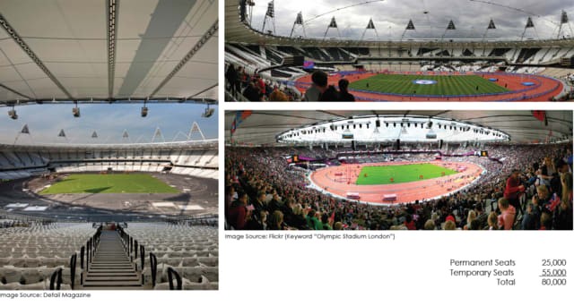 改修工事は、約2万5000席の観客席の撤去や、サッカー試合の観戦環境を改善するために陸上トラックの上を覆う「収納式」可動席(約2万1000席)の設置、観客席の全てを覆う屋根の設置(五輪大会開催時は約40%の観客席が屋根なし)をLLDC側の責任で実施する。