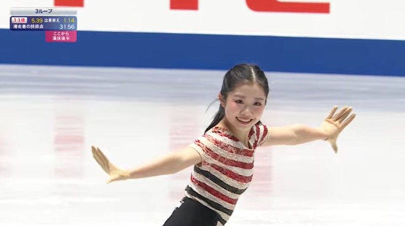 SP4位の千葉百音(木下グループ)は、(木下グループ)が、しなやかな滑りでまとめ、216・24点で順位を上げて3位。しかしジャンプの回転不足が複数とられのは惜しかった。中井亜美(TOKIOインカラミ)は、冒頭にトリプルアクセルに挑んだが、ダブルアクセル判定に。その後は立て直したが、得点は伸び悩み、213・56点で4位。渡辺倫果(三和建装)は7位だった。