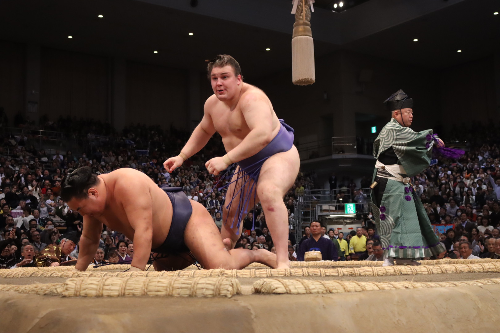 大の里 一昨日の安青錦戦で肩を痛め、休場。豊昇龍の不戦勝