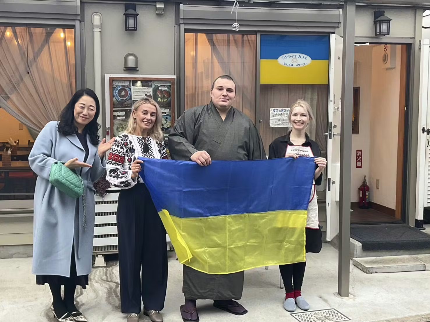 カフェ「クラヤヌィ」を訪問した安青錦(右から2人目、10月、東京都武蔵野市)=日本ウクライナ友好協会KRAIANY提供・共同