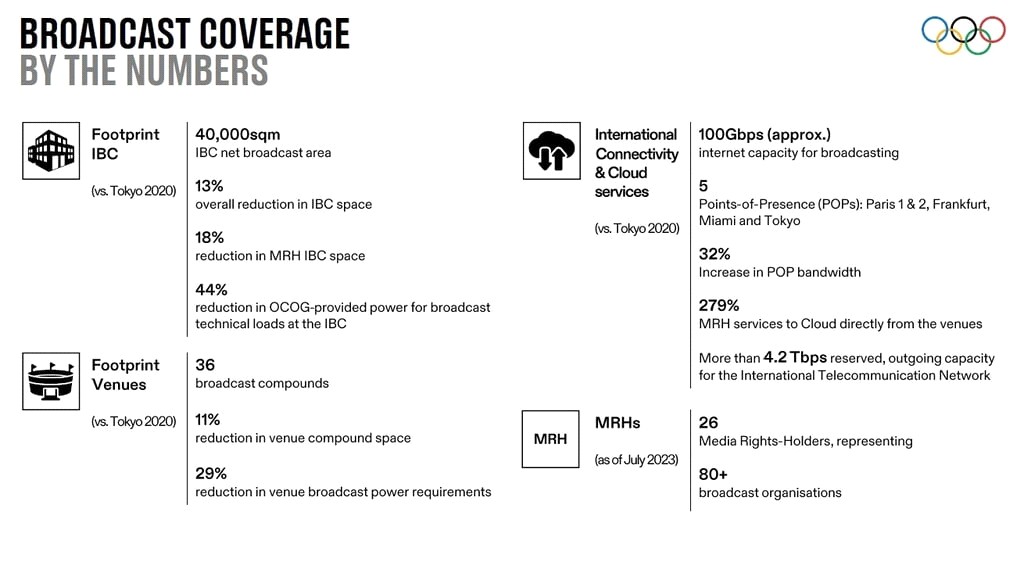 ル・ブルジェのIBCの面積は約40000平方メートル、東京2020のIBCが設置された東京ビッグサイトに比べて全体で約13%、MRHsの占有面積で18%削減された。使用電力量は東京2020に比べて44%、リオデジャネイロ2016に比べると配信時間は2倍に増えたが約72%も削減される。