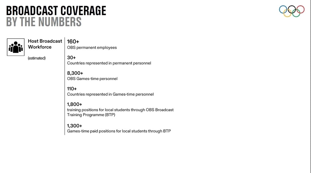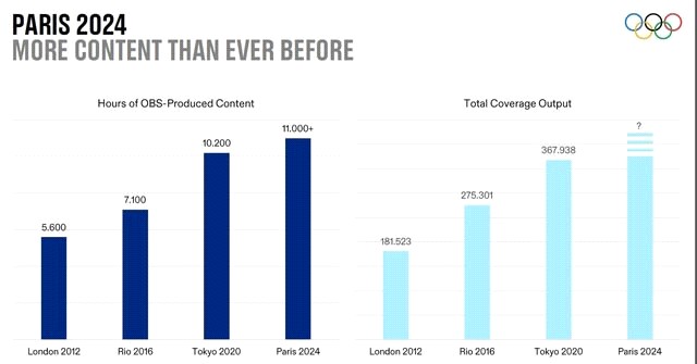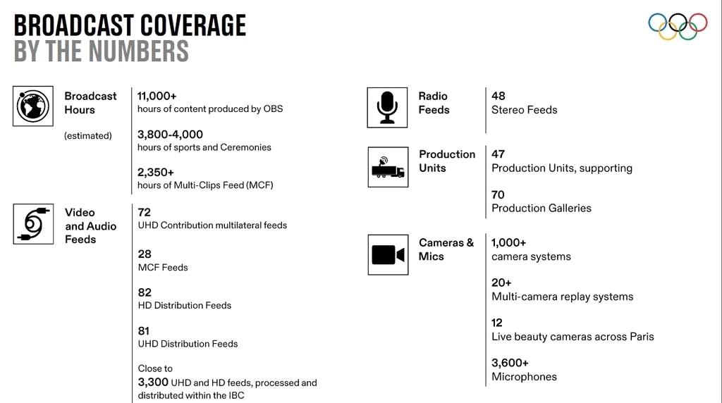 OBSは、Paris2024では41競技場(内サーフィンはタヒチ)で開催される32競技329種目のすべてを4KUHD(Ultra High Definition 12Gbps )/HDR(High Dynamic Range)、音声は 5.4.1 immersive audioでライブ中継を行い、テレビ、ラジオ、デジタル・サービスのライツホルダー(MRHs)に4KUHD、1080p60 HDR、1080iSDR、デジタル・ストリーミングなどのさまざまなフォーマットで配信づつ。総配信時間は史上最高の 11,000 時間超(東京2020・1万200時間 [15.8%増] リオデジャネイロ2016・7100時間[55%増])に史上最高。配信されたHD Feedsは82チャンネル、UHDは81sh、同時に配信されたFeedsは最高30チャンネル以上になった。