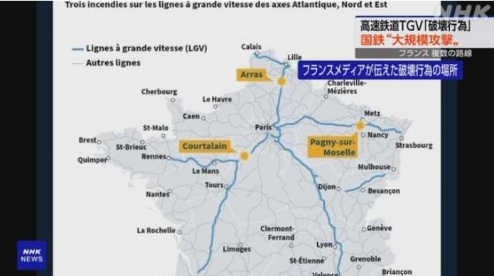 - フランスの高速鉄道TGVの複数の路線で破壊行為発生