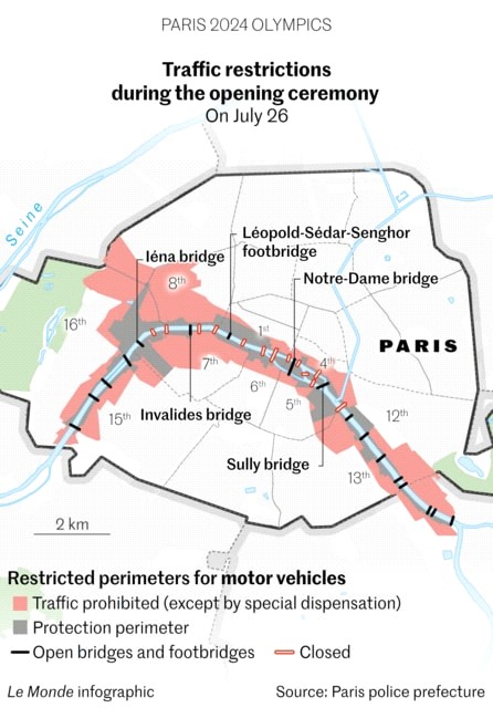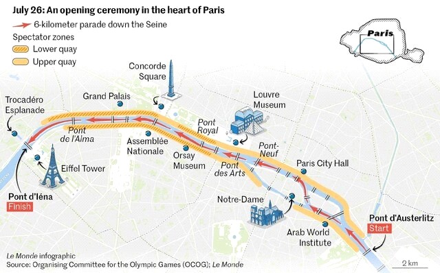 開会式はセーヌ川の全長6キロメートルに沿って3時間以上かけて行われ、200カ国以上からの選手や関係者を乗せた約100隻のボートが参加する史上初の競技場外の開催となる。国家元首や政府首脳を始め30万人(当初は60万人)の観客がこのルートに集まる。川沿いには80の巨大スクリーンが設置され生中継される。開会式はテロ攻撃の格好の標的になる懸念が大きい。