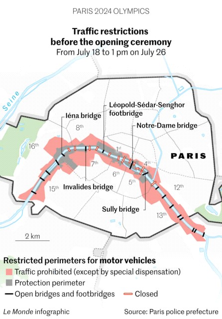 実際には、7月18日から8日間、パリは2つに分断される。「我々は、式典開始の30分前まで、アンヴァリッド、ノートルダム、シュリー橋を含む、パレードの境界内にある5つの橋を含む10の横断ルートを用意した」としている。テロ対策境界内にある地下鉄駅(合計約15駅)は7月18日から閉鎖されるが、路線は通常通り運行される。RER