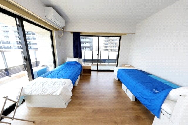 ツインルーム シンプルな内装 各部屋にTOPスポンサーのPanasonic製エアコン、合計1万5000台が設置された 酷暑の東京の夏はエアコンが必須 提供 TOKYO2020