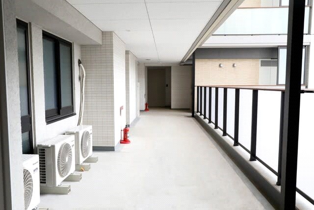 車いす2台がすれ違うことができる外廊下 エアコンの室外機が設置されている 提供 TOKYO2020