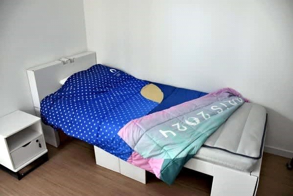 東京2020に引き続きベッドは段ボール製で、日本のベッド製造メーカー、エアウィーヴ社が提供、最大 250 キログラム (約 550 ポンド) の重量に耐えることができる。アスリートの体格に合わせてカスタマイズできる約1万6000床のマットレスが供給されることになっており、バスケットボール選手用に2.2メートルまで拡張できるという。段ボール製のベッドフレームが80パーセントのリサイクル材で造られ、フランスで組み立てられる。選手村の責任者は、パリ大会後に「新たな命を吹き込む」ためにリサイクルする予定だとしている。ベッドの高さを高くすることでパラリンピアンにも使用可能で、 「車椅子に乗っている人は、実際に車椅子からベッドへの移乗が非常に簡単にできます」と関係者は語る。 ボーナスとしてリバーシブルの羽毛布団が提供され、オリンピックでは青色の面、パラリンピックでは緑色の面を使用する。パリ五輪終了後、ベッドフレームはリサイクルされ、マットレスや枕は教育機関や公共性の高い団体などに寄付されることになっている。室内の内装は極めて簡素 エアコンは設置されていない 出典 Paris2024