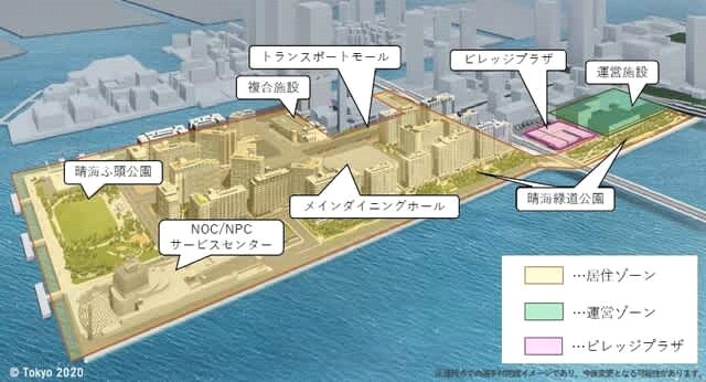 中央区晴海の東京ドーム3個分に及ぶ広大な都有地、約13万4000ヘクタールの敷地に、14~17階建ての21棟のマンション型の選手村と商業施設が建設される。工事費は約954億円。選手村の居住ゾーンは3街区に分けて、約1万7000人の五輪関係者が宿泊可能な施設となる。各住戸は、東京湾の風景が望めるつくり。周辺環境、海からのスカイラインを考慮し、様々な高さの建物を配置するとしている。