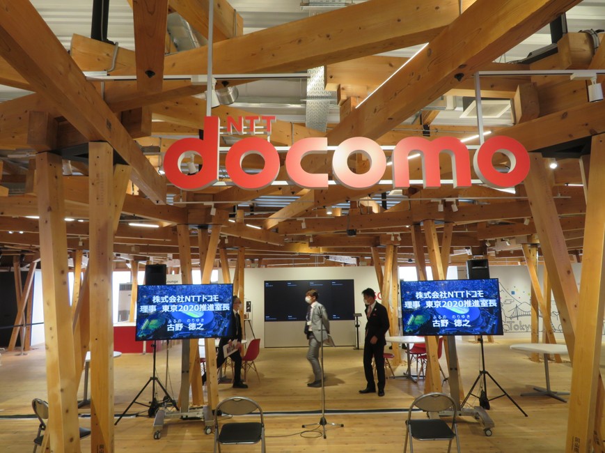 ビレッジプラザには、NTTドコモが協賛して、「docomo 5G LOUNGE」をオープンし、ソフトドリンクや軽食をサービスするとともに次世代通信、5Gを選手やコーチなどに体験してもらうサービスを展開する。また、Galaxyは、「Galaxyアスリートラウンジ」を設置して5GスマホなどをPRする。Canonはフォトスタジオ、アシックスがドライクリーニング・サービス、ヤマトはクーリエカウンター、日本郵政は郵便局、三井住友銀行が両替や入出金窓口を設置する。ビレッジプラザ 筆者撮影