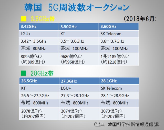- 韓国 5G周波数オークションで携帯電話事業者3社に3.5GHz/28GHz帯割当て決定