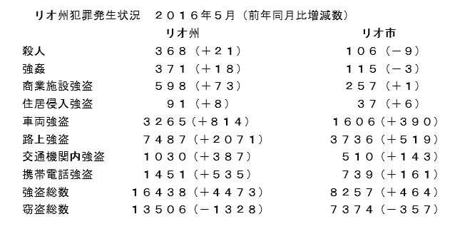 リオデジャネイロ市の2014年の人口10万人当たりの犯罪発生率を日本との比較すると、殺人が約25倍(2014年は23倍)、強盗は約660倍(20134は510倍)と極めて高水準で推移している。