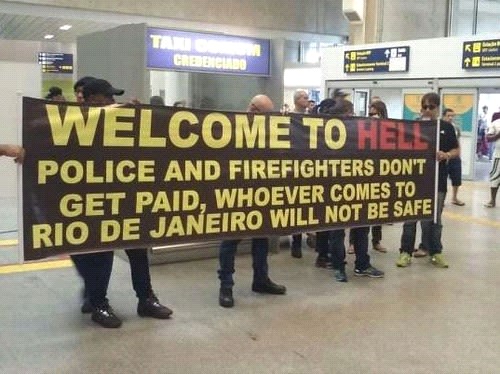 職員らが掲げた横断幕には、「地獄へようこそ。警察と消防士には給料が支払われていない。リオデジャネイロに来る人は誰も安全ではない」と書かれていた。