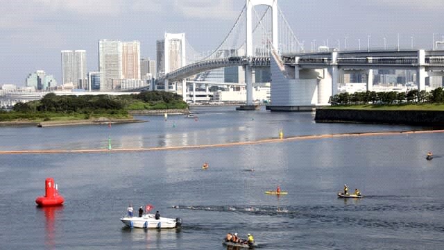東京五輪組織委員会や国際オリンピック委員会(IOC)は、レインボーブリッジや都心のビル群が背景に広がる「都会的なコース」として高く評価して会場として選んだが、問題は東京湾の大腸菌汚染された海水である。東京都はポリエステル製のスクリーンで競技コースを囲み、大腸菌に汚染された水の流入を防ぐという応急対策を講じたが、大雨で大腸菌汚染が基準値を上回る、Tokyo2020のテスト大会を兼ねたパラトライアスロンのワールドカップ(W杯)では、水質が悪化したとしてスイムを中止してランとバイクのデュアスロンに変更することを余儀なくされた。実施した水質検査で大腸菌の数値が国際トライアスロン連合(ITU)が定める上限の2倍を超えという。