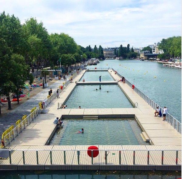 パリプラージュのもう一つの目玉は、パリ市内を流れる運河の中に設けられるプール。運河(ヴィレット貯水池)の一部を区切ってプールが作られ、無料で市民に開放される。定期的な水質チェックが行われるが基準は満たされているようだ。パリプラージュ(Paris Plages)パラソルやビーチチェアが並ぶセーヌ川沿い 出典 Sportir Paris