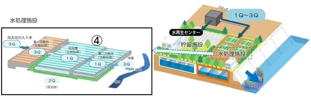 大雨が降って、2Qと超えた場合は、沈殿処理や消毒処理を行う「簡易処理水」として河川等に放流する(2Q~3Q)