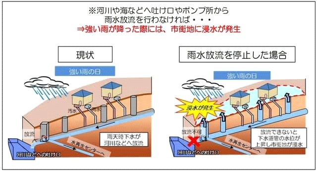 豪雨となって3Q(1Qの3倍)を越えた場合は洪水を防ぐために未処理の汚水混じりの雨水を「雨水吐け口」や「ポンプ所」から排出する。
