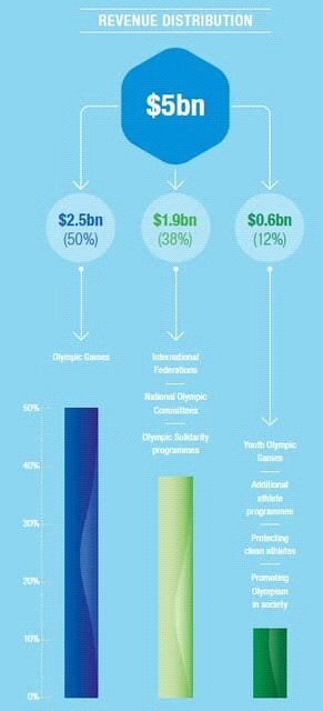 国際オリンピック委員会(IOC)の収入は、ソチ冬季大会とリオデジャネイロ夏季大会が開催された2013年~2016年の4年間で、約57億ドル(約6270億円)、内訳は放送権料が約41億6000万ドル(約4577億円)で73%、TOP Programmeスポンサー料が約10億2600万ドルで18%、その他の権利収入が4%、その他の収入が5%となっている。