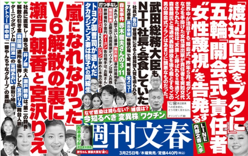 - 「週刊文春」は、2021年3月31日号で、東京五輪開会式の執行責任者だった振付演出家・MIKIKO氏のチームが作成した開会式案の全貌を公表した。MIKIKO氏が責任者を降ろされた直前に、IOC側にプレゼンして称賛を受けた約280ページに及ぶ資料を「週刊文春」が入手して明らかにした。日の目を見ることなく、“なかったこと”にされた開会式案で、資料は昨年4月6日付、新型コロナウイルスの感染拡大に伴って、開催延期が正式決定した直後のものだという。