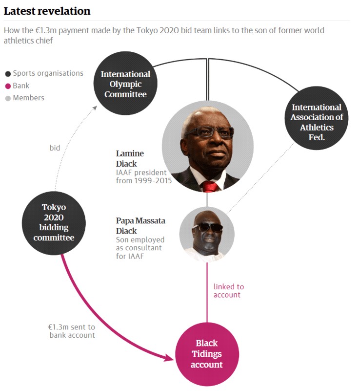 2019年1月11日、仏司法当局は、2020東京五輪五輪招致を巡る贈収賄疑惑で、前国際陸連会長で前IOC委員のラミン・ディアク氏とパパ・マッサタ・ディアクの父子を収賄側、贈賄側として、日本オリンピック委員会(JOC)の竹田恒和前会長を捜査対象として正式に捜査を開始すると明らかにした。仏司法当局は2018年12月に事情聴取をしていた。当時、日本オリンピック委員会(JOC)の組織内で活動していた東京オリンピック・パラリンピック招致員会が、シンガポールのコンサルタントを通じディアク父子に約2億3000万円を支払って、招致を勝ち取った容疑がかけられているのである。