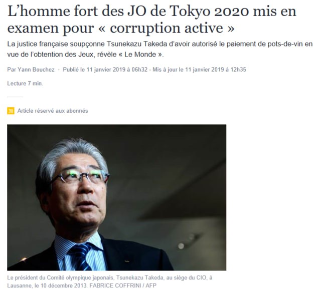2019年1月11日、仏紙ルモンド(電子版)は、2020年東京五輪招致の不正疑惑をこのような見出しで伝え、フランス司法当局が日本オリンピック委員会(JOC)の竹田恒和会長に対し、贈賄容疑で起訴に向けて最終段階の捜査を開始したと報じた。