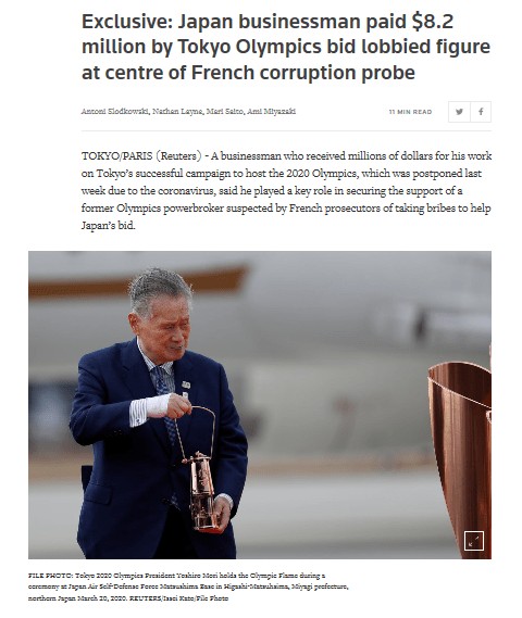 - 2020年3月31日、ロイター通信は、2020東京五輪招致を巡り、大会組織委員会理事を務める広告代理店電通元専務の高橋治之氏が、東京五輪招致委員会から820万ドル(約8億9千万円)相当の資金を受け取り、国際オリンピック委員会(IOC)委員らにロビー活動を行っていたと伝えた。