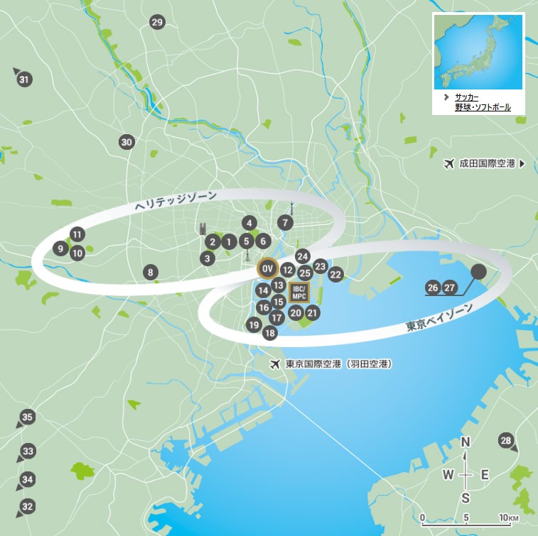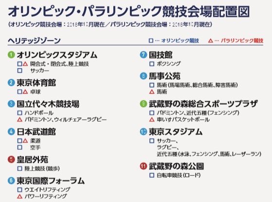 - 2020東京オリンピック・パラリンピックの競技は、1964年の東京オリンピックでも使用された代々木競技場や日本武道館など過去の遺産を活かした「ヘリテッジゾーン」と、有明・お台場・夢の島・海の森など東京湾に面した「東京ベイゾーン」を中心開催する計画である。
