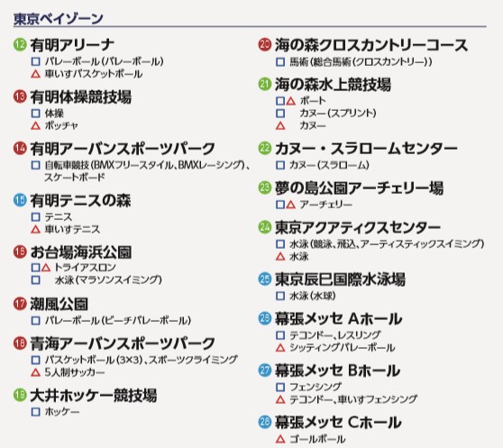 この内、オリンピッックは42会場、パラリンピックは21会場(ボッチャ競技のみ幕張メッセCをパラリンピック単独会場として使用 その他はオリンピックと共通競技会場を使用)である。