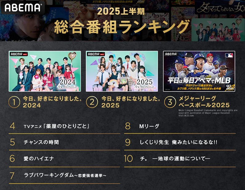 女子中高生から絶大な支持を誇り、“恋の修学旅行”をテーマに、現役高校生たちのリアルで等身大な“恋”と“青春”を追いかける「ABEMA」オリジナル恋愛リアリティーショー『今日、好きになりました。』シリーズが1位・2位を独占。2位は「メジャーリーグベースボール(MLB)」の2025シーズン。4位は『TVアニメ『薬屋のひとりごと』』。笑いコンビ・千鳥がMCを務めるバラエティ『チャンスの時間』が5位、8位にプロ麻雀リーグ「Mリーグ」。
